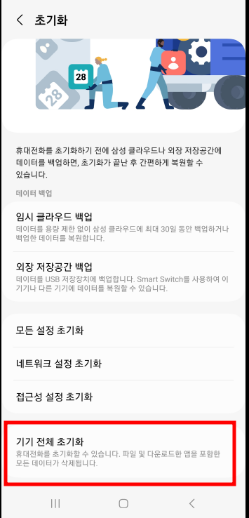 • 초기화 후에는 삭제된 데이터를 복구할 수 없으므로 반드시 백업을 진행해야 함