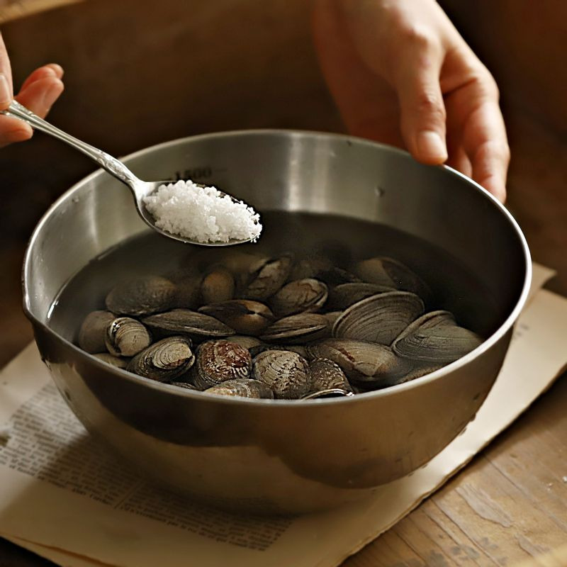 바지락은 염도가 너무 높으면 삼투압 현상 때문에 수분을 뺏겨 죽거나 입을 굳게 다물어버립니다. 반대로 염도가 너무 낮아도 바닷물이라고 인식하지 못해 입을 열지 않습니다. 염도계가 없다면 물 1리터 기준 굵은 소금을 평평하게 두 큰술 정도 넣는 것이 가장 정확합니다. 맛을 보았을 때 짭짤한 바닷물 느낌이 나도록 맞추는 것이 핵심입니다.