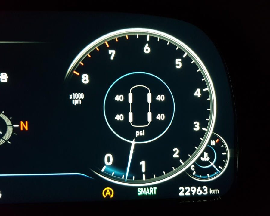 하지만 오분 정도 주행을 하게 되면 아래와 같이 타이어 공기압이 표시되기 시작하는 군요
