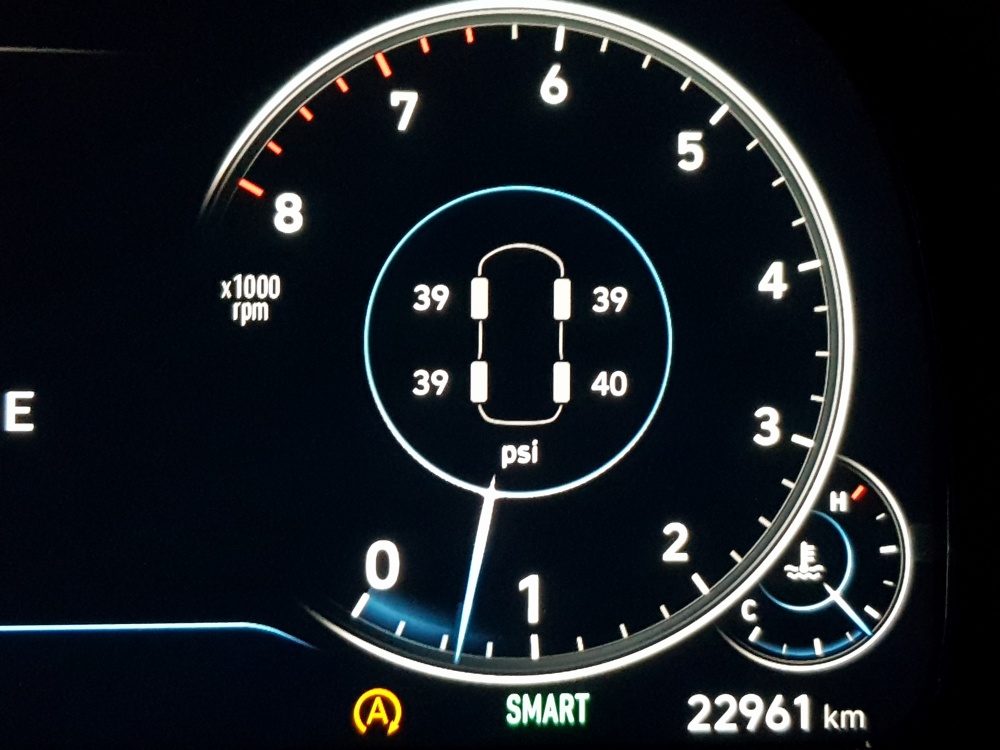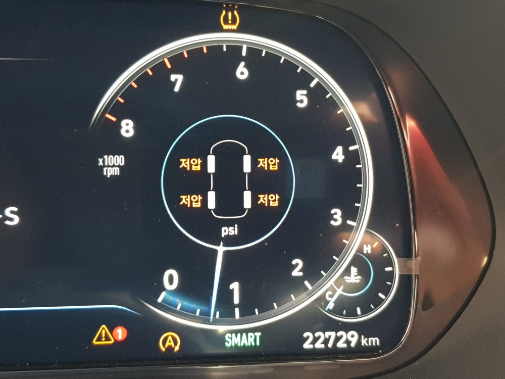 타이어 공기압을 모두 충전하고 나서 시동을 걸면 처음에는 센서가 인식을 잘 못해서 여전히 충전 부족이라고 경고등이 들어옵니다.