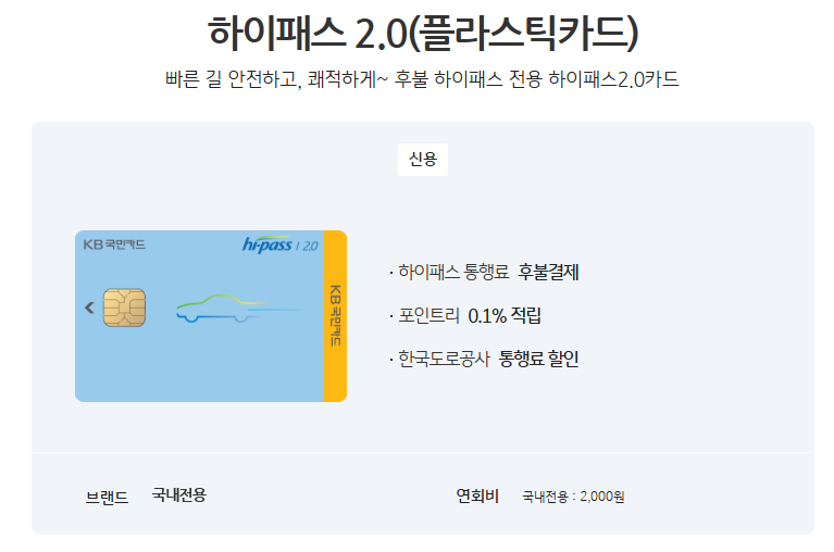 국민카드에서도 전용 후불 하이패스 카드가 있습니다. 이름하여 KB국민 하이패스 2.0 카드인데요, 이 카드는 기존 국민 신용카드 보유자라면 쉽게 추가 발급할 수 있고, 연회비도 2,000원으로 부담 없습니다.