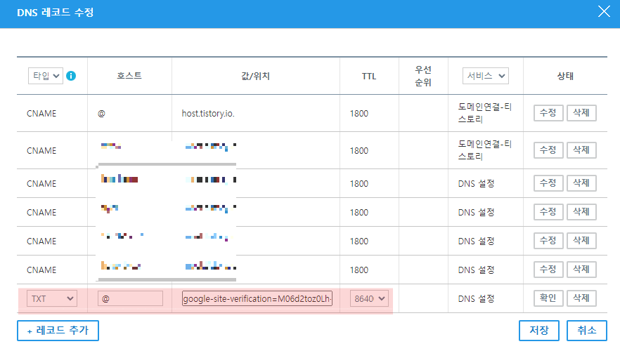 - 값/위치 : 구글서치콘솔에서 복사한 TXT 레코드 값