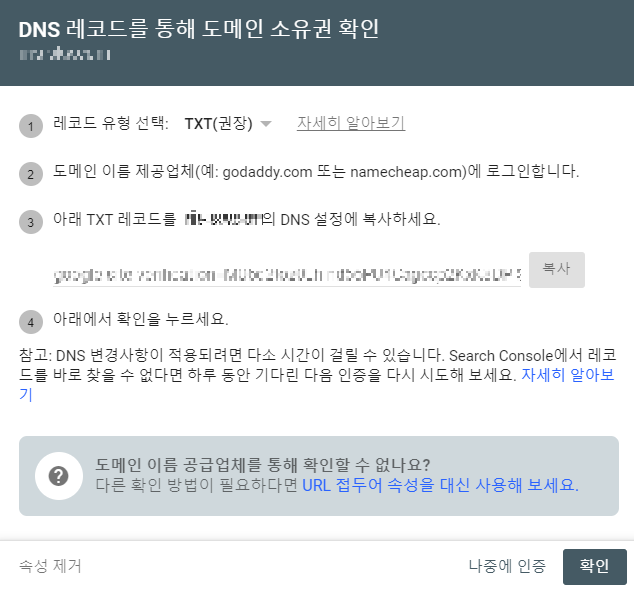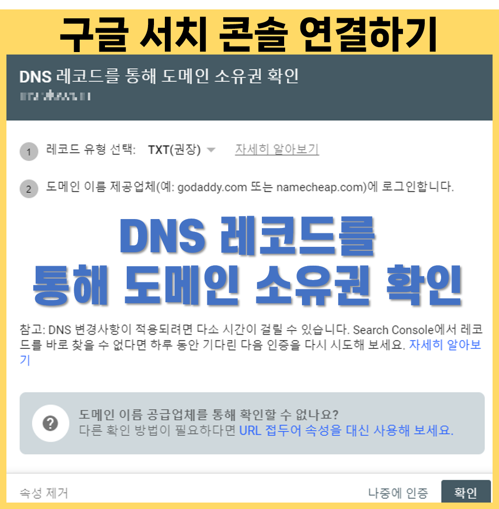 그래서 구글 서치 콘솔에 접속했을 경우 아래와 같이 도메인 소유권을 확인하라는 창이 뜨게 되면 당황하시는 분들이 많이 계실 텐데요