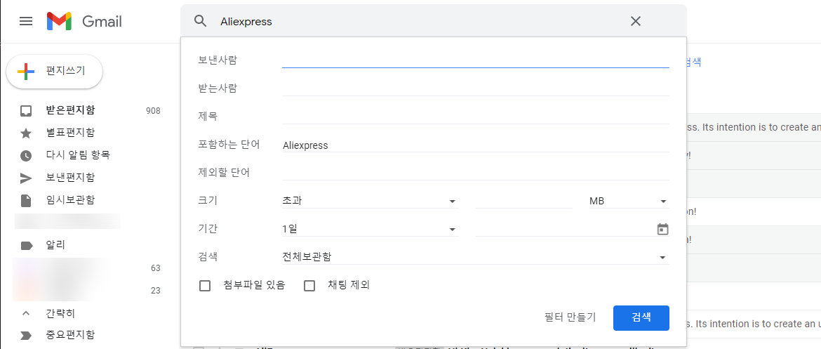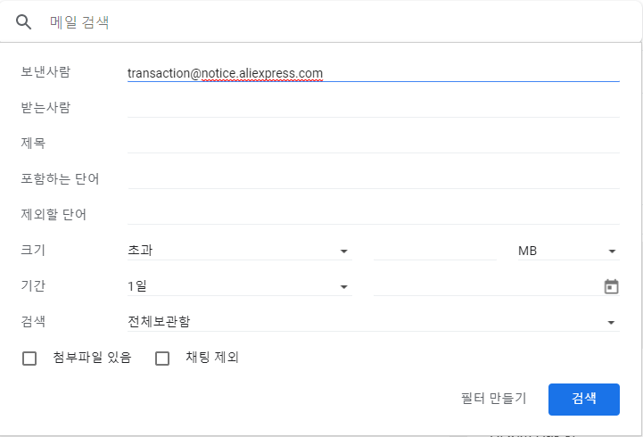 4. 여기에 보낸 사람에 알리익스프레스에서 온 메일의 주소를 복사해서 넣는다.