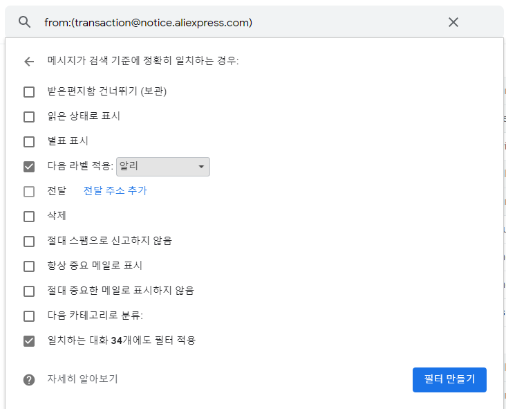 - 아래 일치하는 대화 34개에도 필터 적용을 선택하면 기존에 온 메일도 모두 이 알리라는 폴더로 옮긴다.