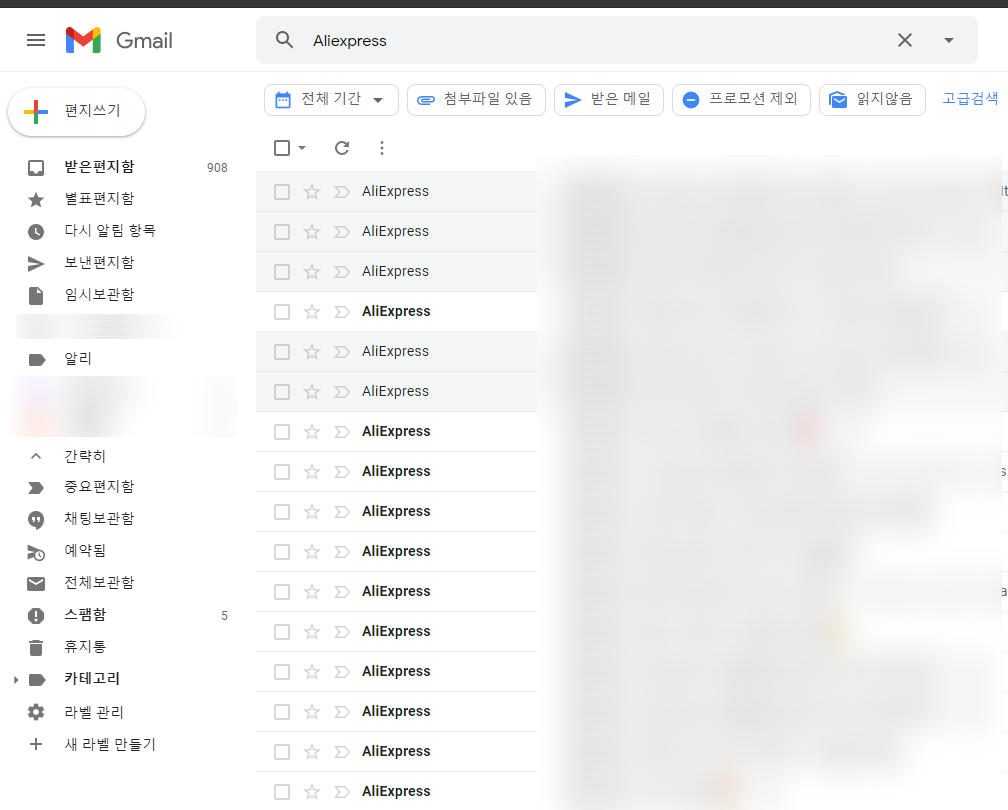 3. 이제 맨위의 검색 창에 Aliexpress를 입력하게 되면 그동안 수신된 해당 메일이 쫙 정렬된다.