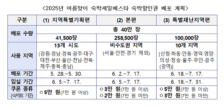수도권(서울, 경기, 인천)을 제외한 비수도권 지역의 숙박시설을 대상으로 진행되며, 7만 원 이상 숙박상품 예약 시 3만 원, 2만 원 이상 7만 원 미만의 숙박상품 예약 시 2만 원의 할인권이 제공됩니다.