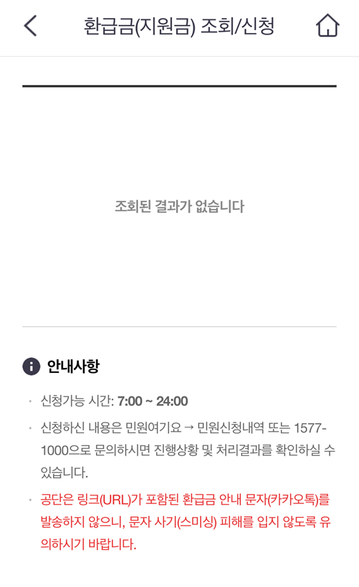 - 조회 화면에서 ‘환급 신청’ 버튼 선택