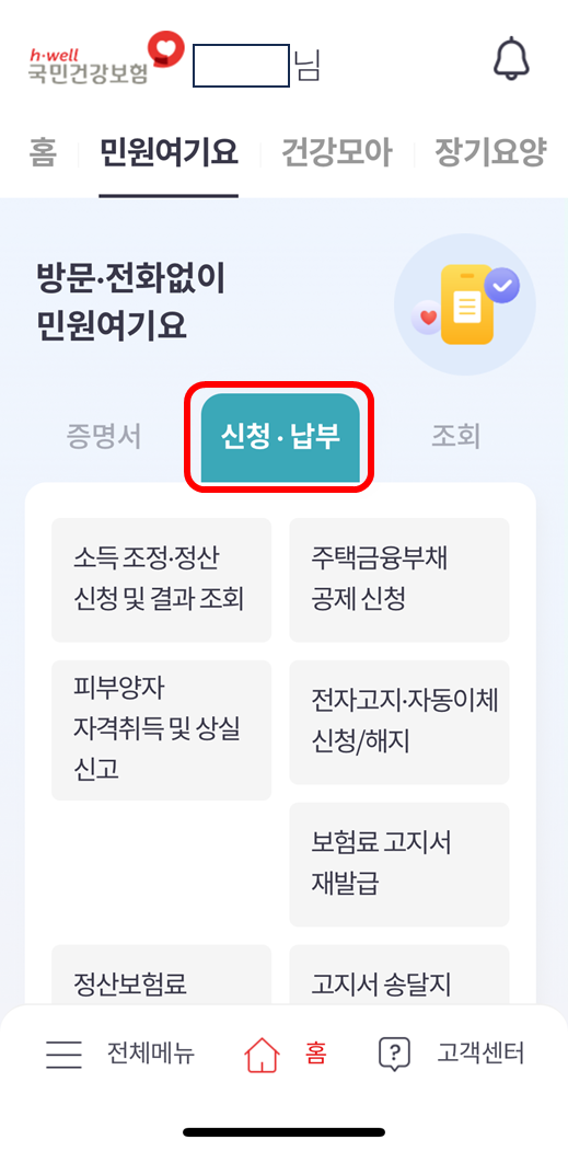 ✅ 먼저 로그인 하신 후에 국민건강보험 페이지에 가시면 아래와 같은 메인 화면이 나타납니다.