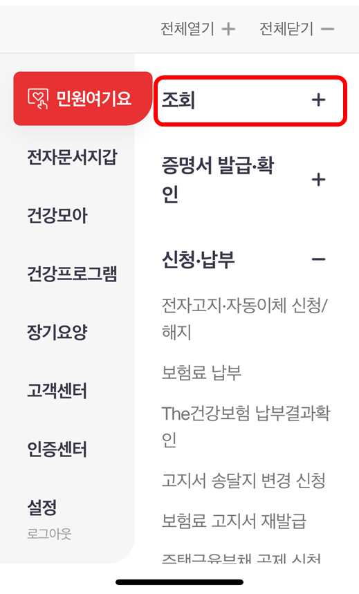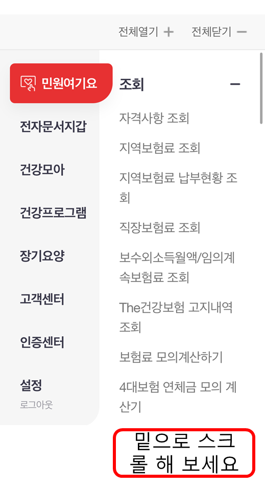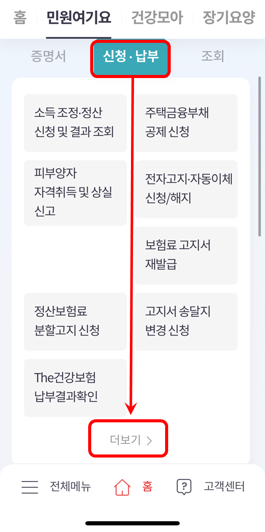 ✅ 신청/납부로 들어가신 다음에 화면을 스크롤해서 조금만 더 내려보시면 "더보기" 라는 메뉴가 있는데요, 더보기를 눌러보세요.