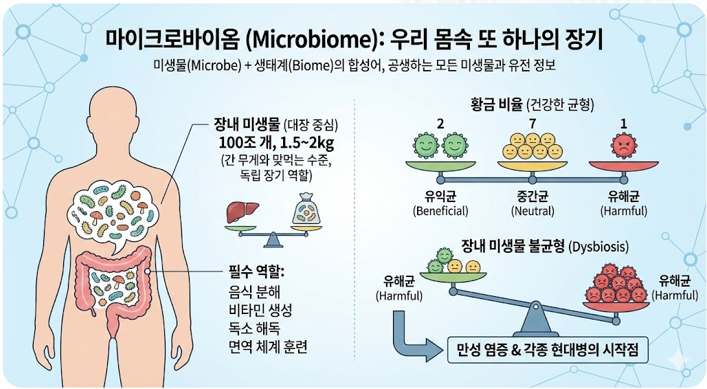 마이크로바이옴(Microbiome)은 미생물(Microbe)과 생태계(Biome)의 합성어로, 우리 몸에 공생하는 모든 미생물과 그들의 유전 정보를 통칭합니다. 그중에서도 대장을 중심으로 서식하는 장내 미생물은 그 수가 100조 개에 달하며, 무게만 해도 1.5킬로그램에서 2킬로그램에 이릅니다. 이는 우리 몸의 간 무게와 맞먹는 수준으로, 현대 의학에서는 이를 독립적인 역할을 수행하는 하나의 장기로 간주하기도 합니다.