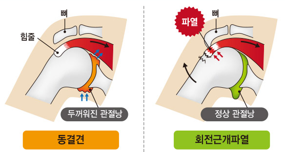 - 주요 증상: 별다른 징조 없이 갑자기 어깨가 빠질 듯이 아픕니다. 통증이 너무 심해 팔을 전혀 움직이지 못하는 경우가 많습니다.