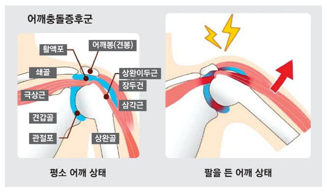 어깨의 지붕 역할을 하는 뼈인 '견봉'과 어깨 힘줄인 '회전근개'가 팔을 움직일 때마다 서로 부딪히며 염증을 일으키는 질환입니다.