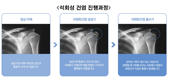 - 관리 팁: 체외충격파 치료가 매우 효과적인 질환입니다. 석회가 흡수되는 시기에 통증이 가장 심하므로 전문가의 도움을 받아 통증 관리를 해야 합니다.