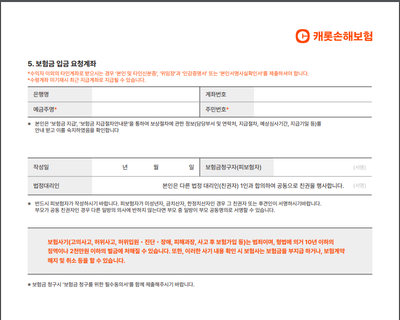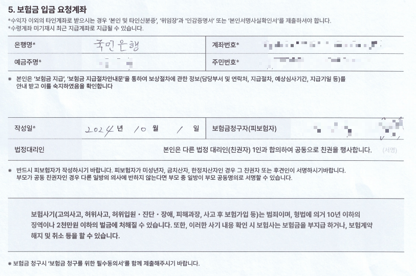 마지막 보험금 입금 요청계좌 란도 정확하게 본인의 계좌를 입력해 주시면 총 5장의 보험청구서 작성이 마무리됩니다.