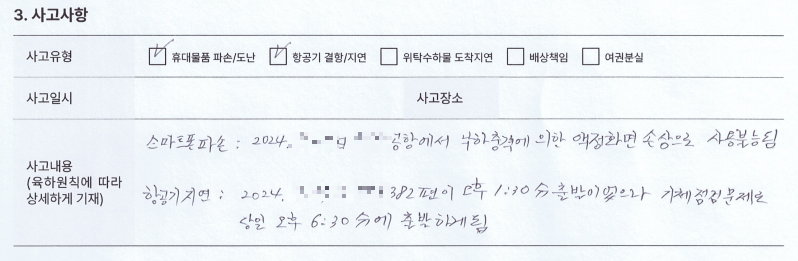 저는 휴대물품 파손도 있었고, 항공기 지연도 동시에 발생했기 때문에 아래와 같이 체크하였습니다.