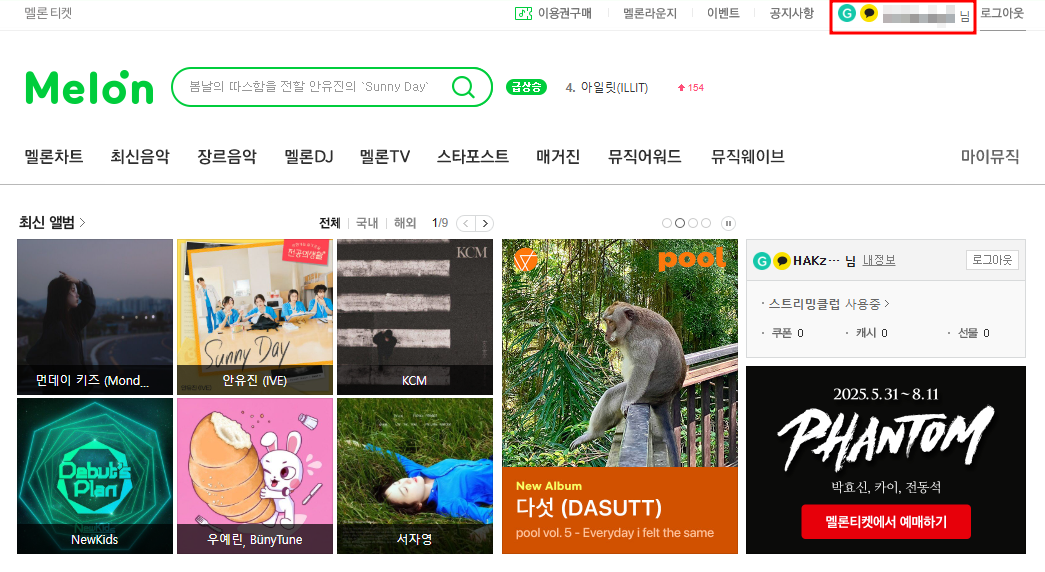먼저 웹 브라우저에서 https://www.melon.com에 접속한 후, 본인의 멜론 계정으로 로그인합니다. 로그인 버튼은 우측 상단에 위치해 있습니다.