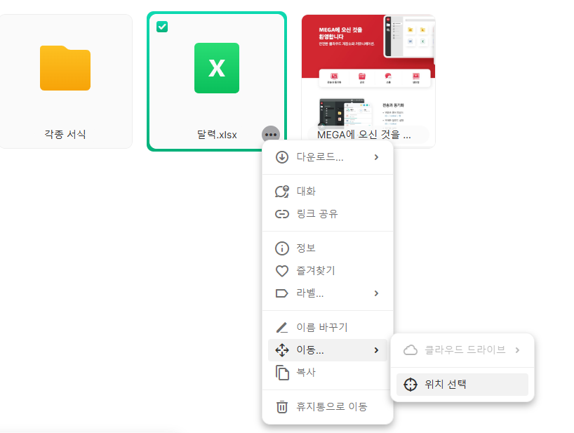 이제 달력이라는 엑셀파일을 내가 아까 만든 각종 서식 폴더에 보관하려면 엑셀파일 아래 점세개 클릭해서 이동 > 위치 선택으로 가면 됩니다.