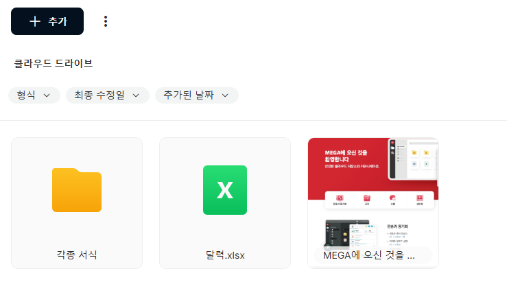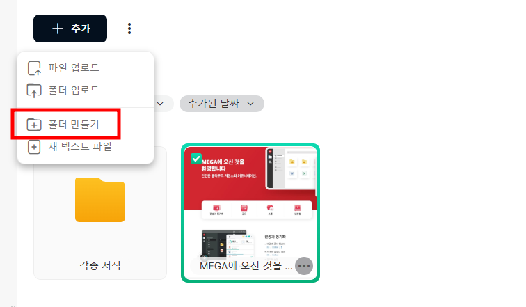 추가를 누르게 되면 하위 메뉴로 파일 업로드나 폴더 업로드 그리고 폴더 만들기 등의 메뉴가 나타납니다.