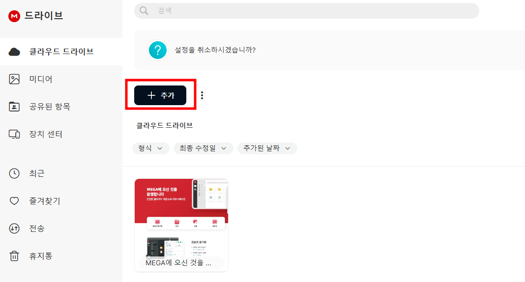 추가를 누르게 되면 하위 메뉴로 파일 업로드나 폴더 업로드 그리고 폴더 만들기 등의 메뉴가 나타납니다.