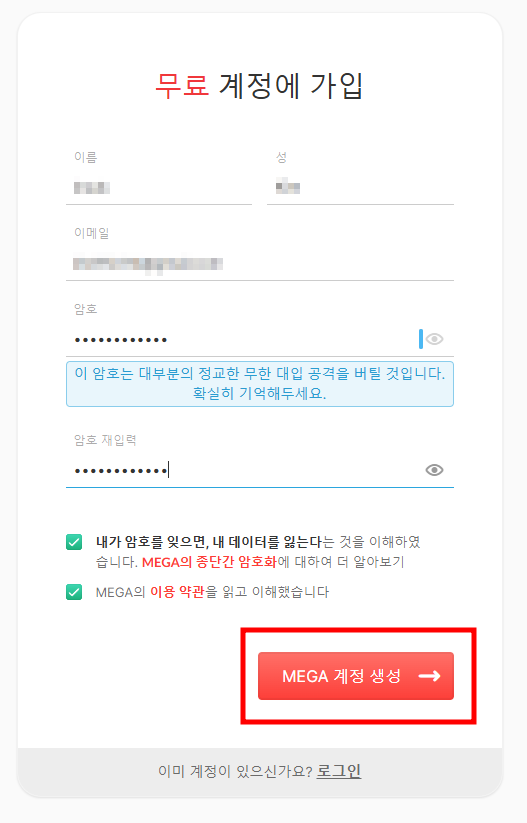 다 입력했으면 MEGA 계정 생성으로 진행하세요.