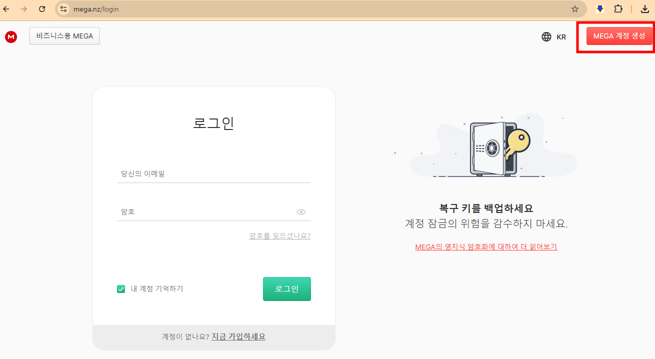화면 상단 우측에 MEGA 계정 설정 버튼을 눌러 계정 생성 페이지로 들어갑니다.