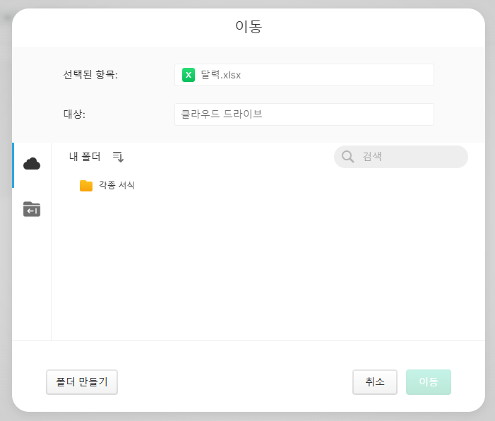 이제 달력이라는 엑셀파일을 내가 아까 만든 각종 서식 폴더에 보관하려면 엑셀파일 아래 점세개 클릭해서 이동 > 위치 선택으로 가면 됩니다.