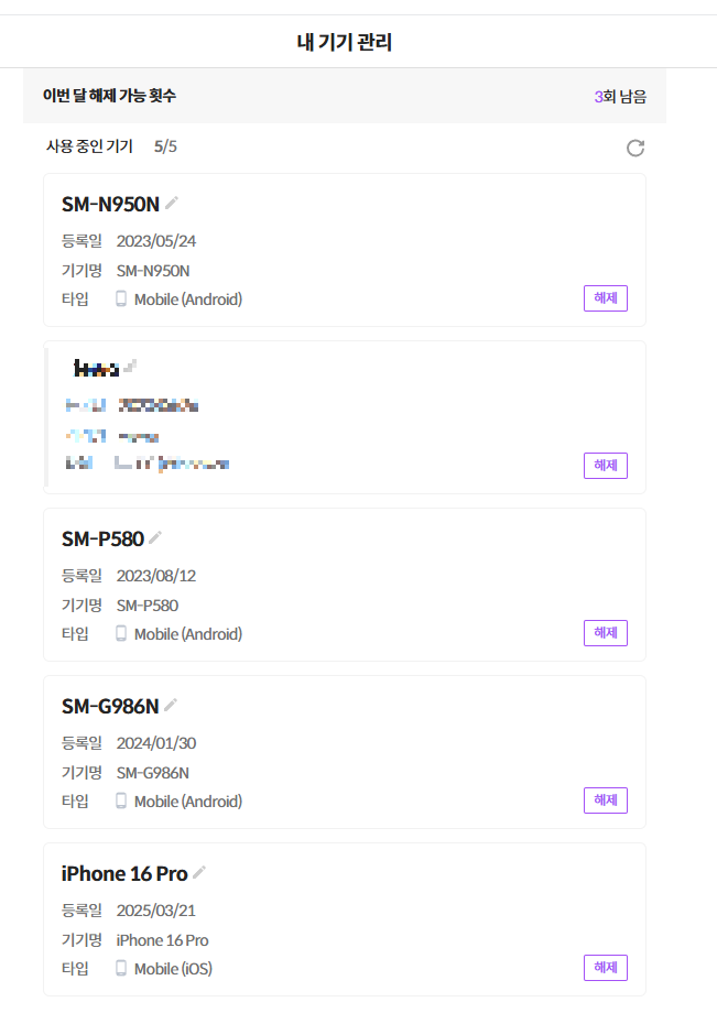 저는 예전의 스마트폰들이 등록되어 있어서 다 해제시켜 주었습니다.