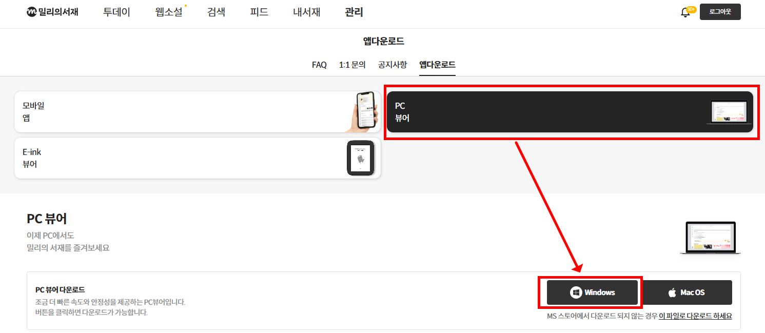 먼저 밀리의 서재 PC뷰어 다운로드 페이지로 가셔야 합니다.