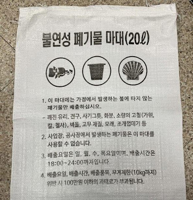 - 일반 종량제봉투가 아닌 ‘불연성 폐기물’ 또는 ‘소형 폐가전류’로 지정된 날에 맞춰 배출합니다.