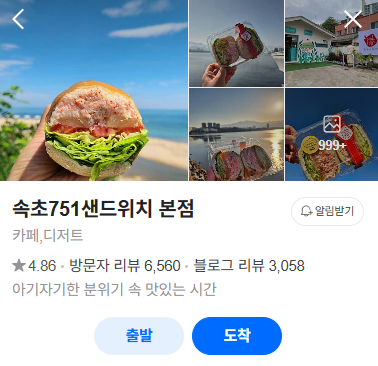 속초 시내에서 간단하게 브런치를 즐기고 싶다면 속초751샌드위치 본점을 추천드립니다. 커다란 바게트 사이에 아보카도, 계란, 햄 등을 풍성하게 넣은 샌드위치가 인기입니다. 커피와 함께 간단하게 한 끼를 해결하거나, 포장해 해변에