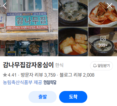 강원도 특산 요리인 감자옹심이를 전문으로 하는 감나무집은 부드러운 식감과 깊은 국물 맛이 매력입니다. 직접 손으로 빚은 옹심이는 쫄깃하면서도 촉촉하며, 담백한 멸치육수와 환상적인 조합을 이룹니다. 속이 편안해지는 식사를 원한다면 이곳을 추천합니다.