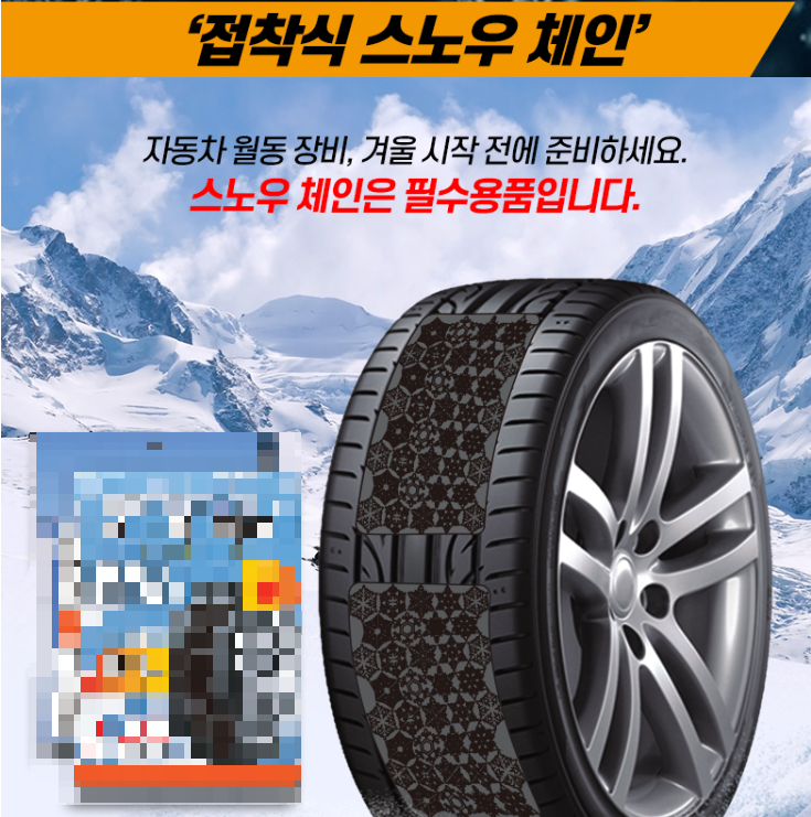 인터넷 쇼핑몰에서 "접착식 스노우 체인" 으로 검색하시면 다양한 제품을 만나실 수 있는데요, 개인적으로는스프레이 체인과 함께 비상용으로 구비하여 놓으면 정말 좋을 것 같네요