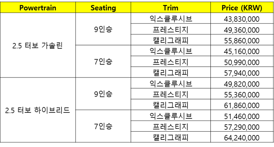 이번 모델은 2.5 가솔린 터보 엔진 과 하이브리드 사양을 탑재했으며, 7인승과 9인승으로 구성되어 있어 실용성과 고급스러움을 동시에 제공하고 있습니다. 각 트림별 사양과 가격을 요약하면 다음과 같습니다.