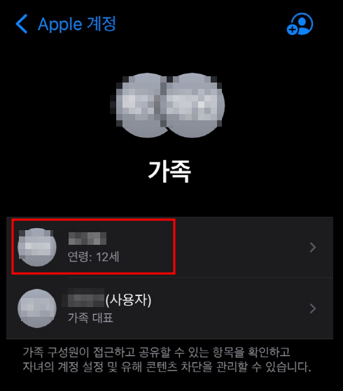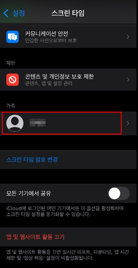 이제 설정의 스크린타임으로 다시 들어가서 스크롤을 밑으로 내리면 자녀가 추가된 것을 확인하실 수 있습니다.