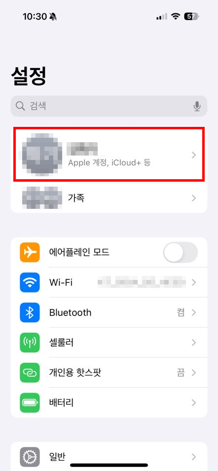 2) 설정으로 들어가서 맨위에 내이름이 나오는 곳을 탭하여 들어갑니다.