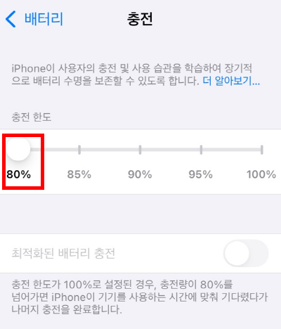 그리고 이런 80% 충전 기능을 떠나서 요즘 배터리가 빨리 닳는다던가 하는 느낌이 들면 배터리 성능이 매우 저하된 상태이기 때문에 성능 체크해 보시고 교체해 보시는 것도 방법이 될 수 있습니다.