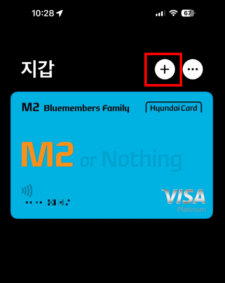 들어가시면 아래와 같은 화면이 뜰 텐데요, 이미 애플페이용 카드를 등록하신 분들은 저처럼 카드가 뜨게 될 겁니다. 하지만 아무것도 등록안하신 분들은 그냥 빈화면이 뜰텐데 그런거랑 상관없이 우측 상단에 "+" 버튼을 클릭합니다.