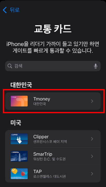 교통카드 클릭하고 나면 대한민국에 Tmoney 가 보입니다.