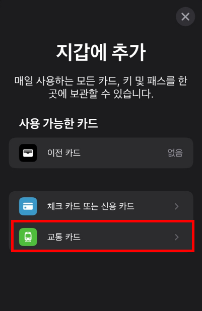 클릭하면 아래와 같이 교통카드가 보일 거에요. 교통카드를 클릭합니다.