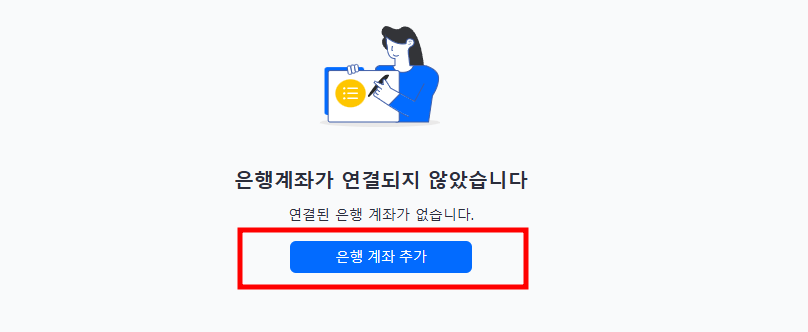 3. 은행계좌가 연결되지 않았습니다 라는 문구가 뜨는데, 아래 은행 계좌 추가 버튼을 클릭합니다.