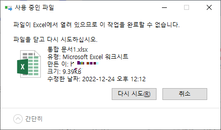 엑셀작업 후 파일을 닫고 나서 해당 파일을 삭제하려고 할 때 파일이 열려 있다면서 안닫히는 경우가 꽤 많습니다.