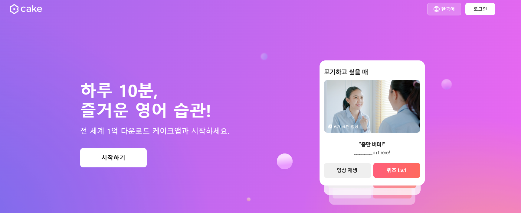 Cake은 영화, 애니메이션, 유튜브 등 다양한 영상 콘텐츠로 구성되어 있어 지루함 없이 딕테이션을 할 수 있는 앱입니다.
