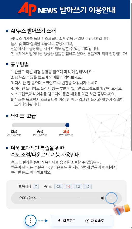 해커스에서 제공하는 AP NEWS 요약 음원은 길이가 30~50초 정도라 부담 없이 들을 수 있습니다. 매일 새로운 주제가 올라오고 속도 조절·구간 반복 기능도 지원하여 딕테이션 연습에 최적화되어 있습니다.
