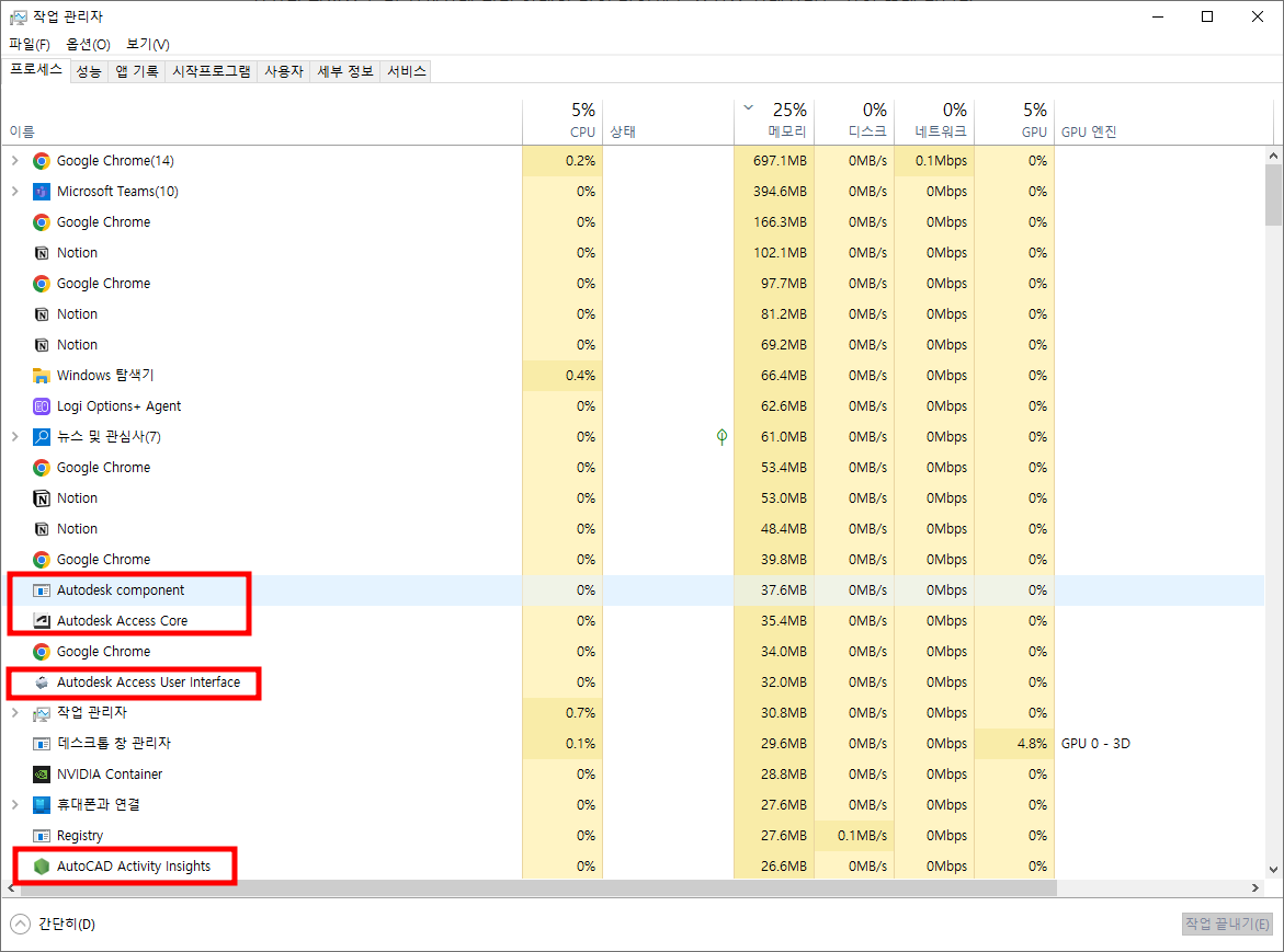 먼저 작업관리자에 들어가서 오토캐드 관련된 프로세스는 모두 중지시킵니다.