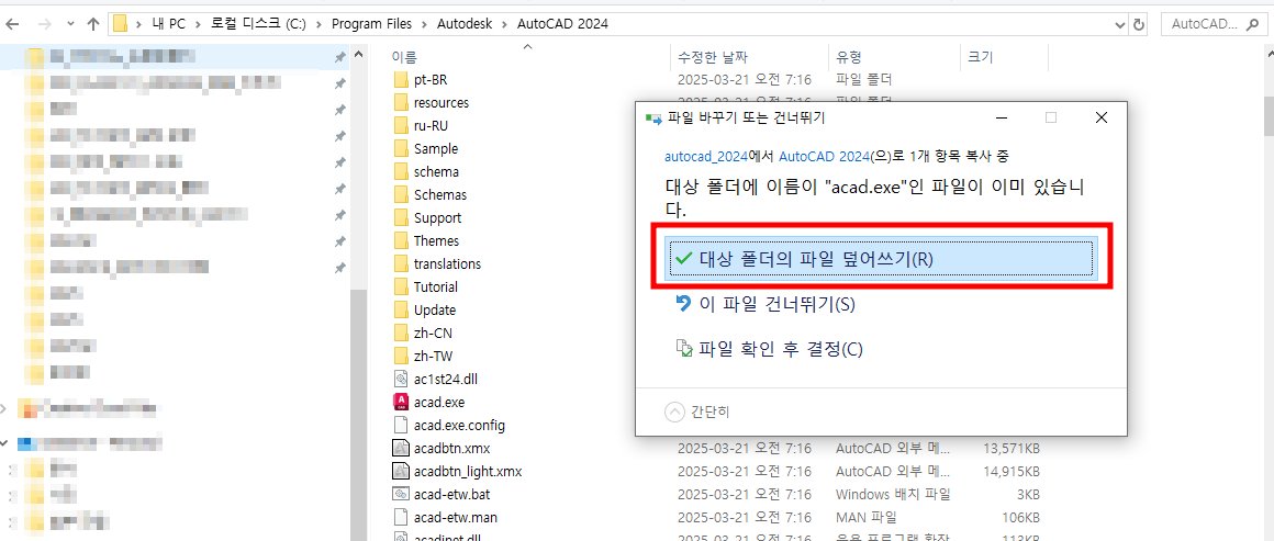 아마 기존의 acad.exe 가 있을텐데, 이제 아래와 같이 덮어 씁니다.