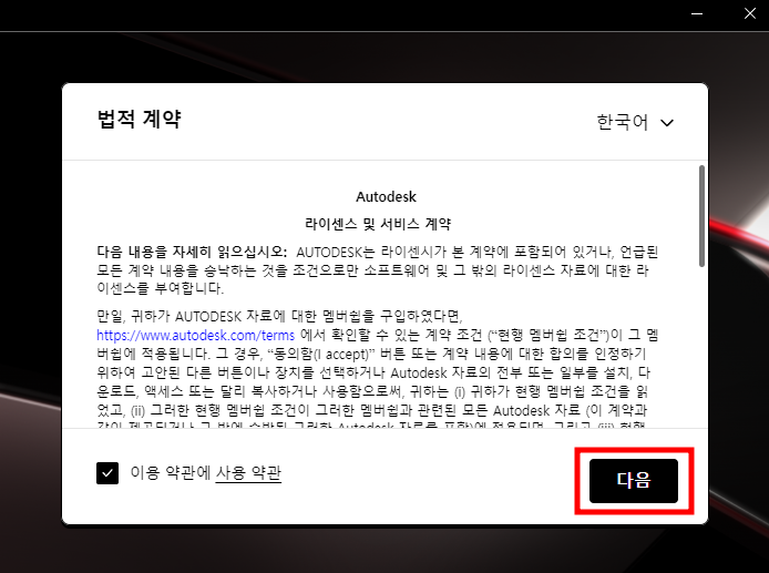 법적 계약 부분은 이용 약관에 체크한 후 다음을 눌러 넘어갑니다.