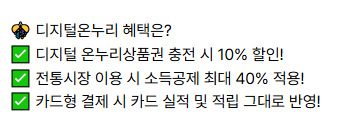 요즘에는 지류 상품권뿐만 아니라 디지털 온누리상품권을 사용하는 분들도 많습니다. 디지털 상품권은 행사 기간에 맞춰 별도의 추가 혜택도 제공되는데, 2025년 5월부터 9월 30일까지 진행되는 할인·환급 이벤트가 대표적입니다. 디지털 온누리상품권을 사용할 경우 10% 구매 할인에 더해 사용액의 10%를 환급받을 수 있습니다. 즉, 최대 20% 수준의 절약 효과를 얻을 수 있다는 이야기입니다.