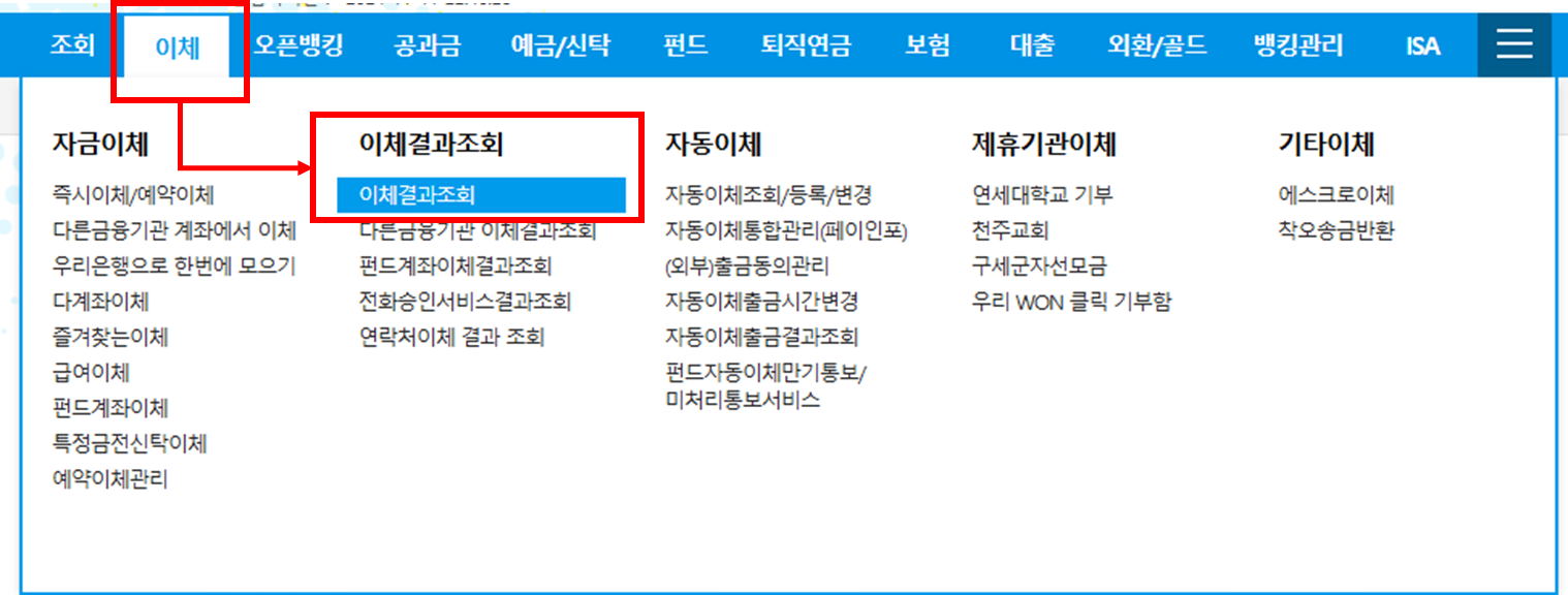 3️⃣ 거래 내역 조회: 메뉴에서 이체를 선택하고, 이체결과 조회에서 원하는 거래 내역을 찾습니다.