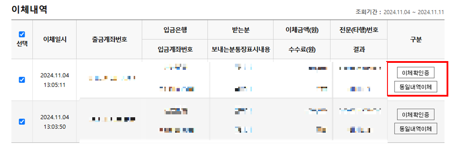 4️⃣이체 확인증 발급: 해당 거래 내역을 선택하면 이체 확인증 발급 옵션이 나타납니다.